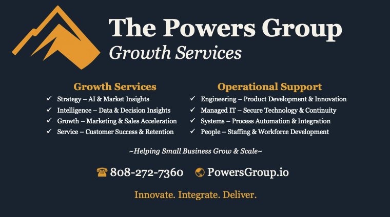 The Powers Group is a Hawai'i based firm providing growth services and operational support to help local small business. We deliver solutions in growth strategy and data analytics, AI-driven software and marketing, managed IT and cybersecurity, consulting and project management.